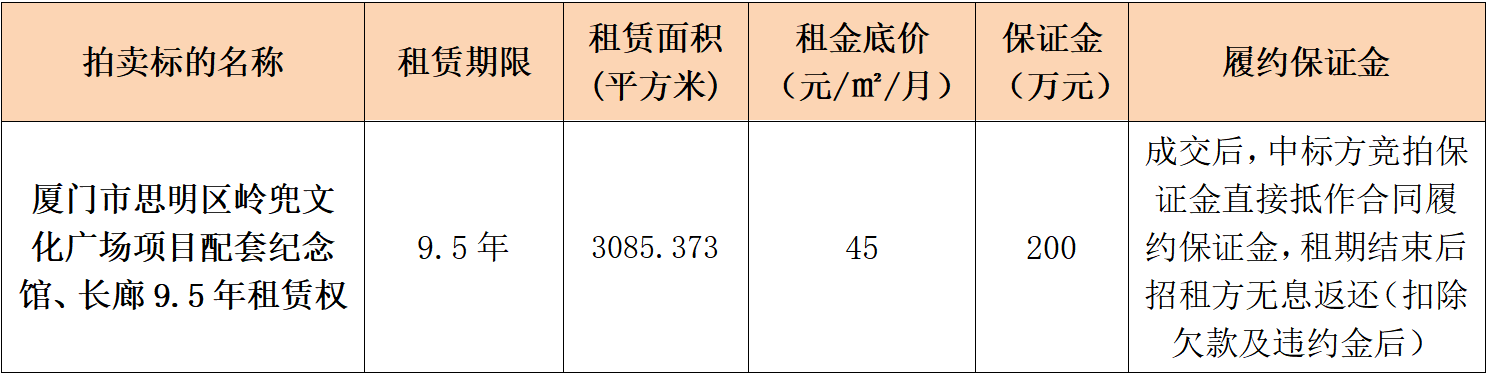 厦门市思明区岭兜文化广场项目配套纪念馆、长廊9.5年租赁权(整体招租)拍卖公告