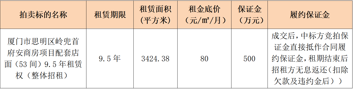 兹定于2025年10月17日(星期五)15时30分在厦门市思明区厦禾路878号铁道大厦24层AB单元拍卖大厅举行房地产租赁权拍卖会。拍卖标的:厦门市思明区岭兜首府安商房项目配套店面(53间)9.5年租赁权(整体招租),起拍价:80元/㎡/月,保证金:500万元。看样时间:2025年10月14日-15日(工作时间),看样地点:标的物现场。保证金缴交及报名截止时间:2025年10月16日17时15分止(以保证金到达厦门产权交易中心账户时间为准),有意竞租者须在截止时间前到报名地址提交完整报名材料视为有效报名。