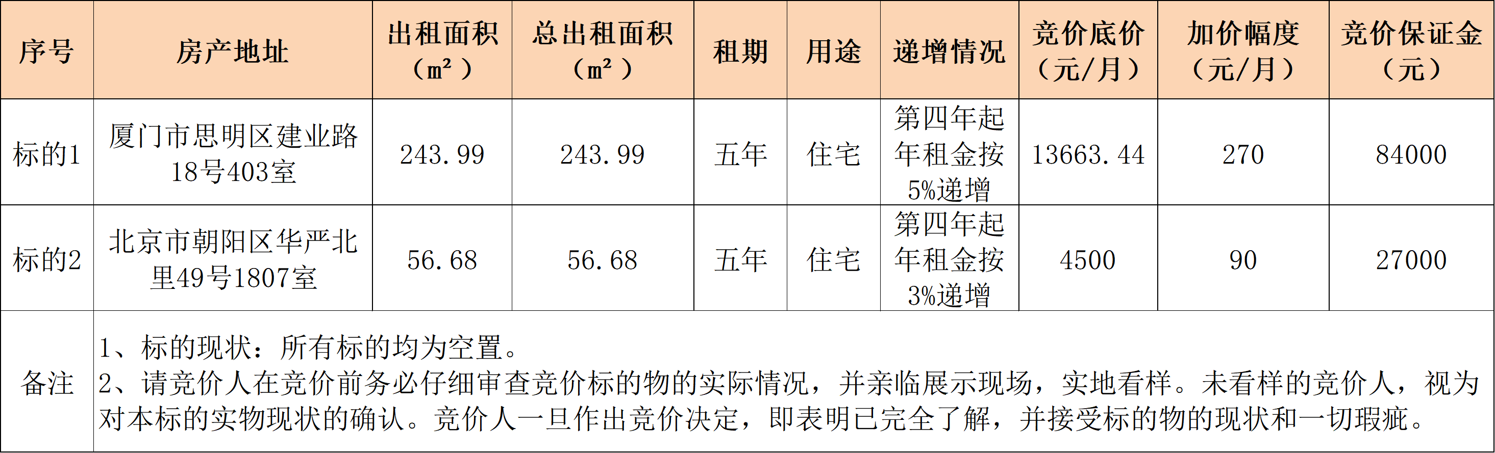 受委托,我公司定于2025年11月7日09:30起在厦门市资产资源交易系统(网址:/index.html)采用网络竞价方式公开招租:“厦门市思明区建业路18号403室等2处房产五年租赁权”,招租标的如下: