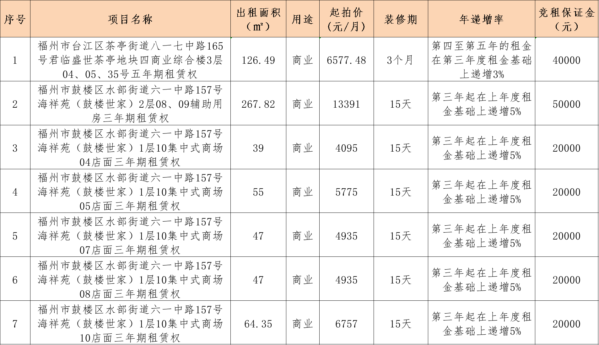 兹定于2025年11月07日上午10时在中拍平台(https://paimai.caa123.org.cn/)公开拍卖:1.福州市台江区茶亭街道八一七中路165号君临盛世茶亭地块四商业综合楼3层04、05、35号店面的五年期租赁权2.福州市鼓楼区水部街道六一中路157号海祥苑(鼓楼世家)2层08、09辅助用房及1层10集中式商场04、05、07、08、10店面的三年期租赁权标的具体信息详见以下清单。